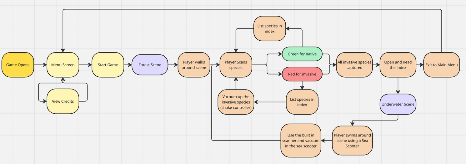 Our project was a Virtual Reality game made for younger audiences in education. We were focused on teaching our audience the importance of invasive species and how they impact the native environment. Through gameplay, the students would scan different animals in the environment and learn if they were invasive or native. If the species were invasive, they could use their vacuum cleaner to remove them from the environment.