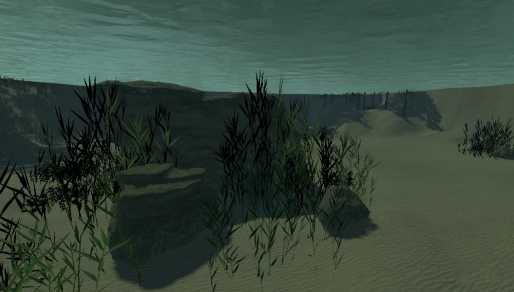 Once the player moved into the water, we replaced both of their hands with the sea scooter, which found the midpoint between their two hands and rotated based on the average of the two hand rotations. Holding the two primary buttons let the player move in the direction the scooter was facing. The two tools were also still mounted to the scooter and both worked with the triggers just as they did on land.